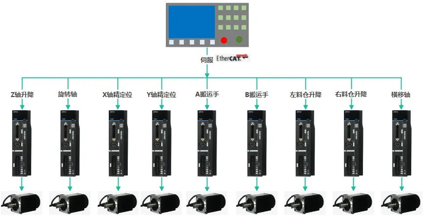 EtherCAT組網(wǎng)通訊,各個伺服在不同的工位分別控制升降、旋轉(zhuǎn)、搬運等工作,實現(xiàn)高速高精密生產(chǎn)。現(xiàn)場圖片及流程示意圖如下。